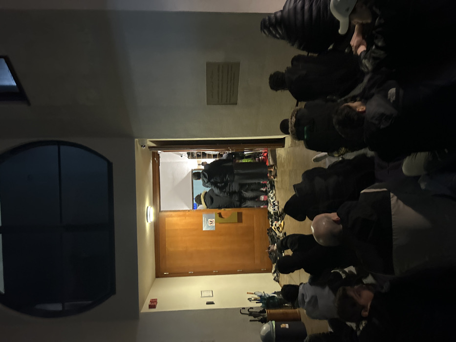 People are praying in a room with a wooden door. Many pairs of shoes are piled in front of the door. Some umbrellas and a trash can are near the praying people. A round window and a plaque are visible on the wall. The scene is dimly lit, possibly at night.