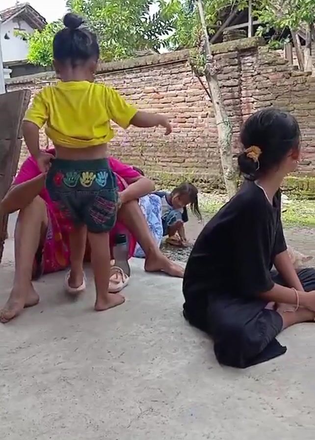 The scene unfolds outdoors, on a weathered concrete surface near a brick wall and lush greenery. A woman in a pink and red patterned dress is seated cross-legged, engrossed in eating from a plate, while another woman stands behind her, carrying a baby. To the woman's right, a young girl in a black top and pants sits in a similar cross-legged position, gazing away from the camera. In front of the woman eating is a toddler wearing a yellow shirt and patterned shorts, seemingly interacting with her. Beside them, another small child in blue attire is crouched down, engaged in play. The environment is shaded by trees, with glimpses of a building in the background. A small white pig roams on the right side of the frame. There's an overall sense of a casual, familial moment.