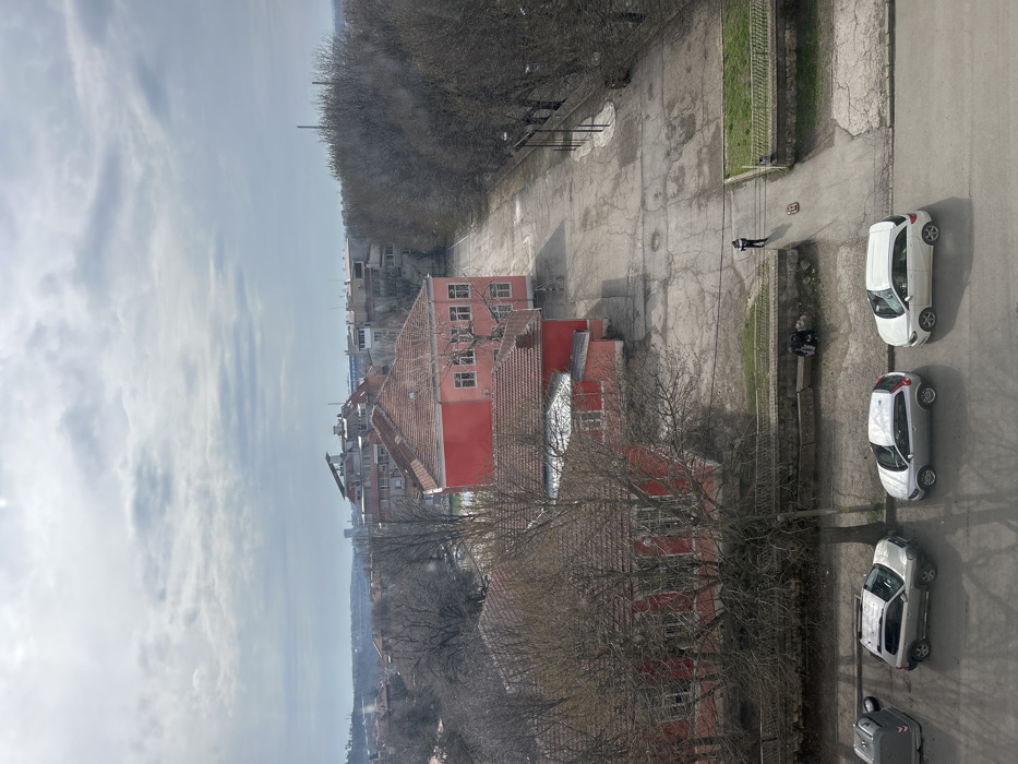 An aerial perspective captures an urban scene in Ruse, Bulgaria, under an overcast sky. In the foreground, a paved street runs horizontally, featuring a grey waste bin on the left and three parked vehicles: a grey SUV, a silver compact car, and a white compact car or station wagon. Parallel to the street, a low concrete wall separates the pavement from an inner area. Two individuals are seated on a bench behind this wall, partially obscured by a bare tree trunk. Further into the paved space, a single individual stands near an open gateway, wearing dark clothing with white stripes across the torso, facing away from the camera. A reddish-brown object rests on the ground near this person. The midground is dominated by two buildings with red-tiled roofs and faded red-pink stucco facades. The larger building on the left is a two-story structure with multiple windows. A smaller, single-story building is situated adjacent to it. Both structures are partially framed by bare deciduous trees. To the right of these buildings extends a large, asphalt-paved courtyard or open area, exhibiting visible cracks. Along the right perimeter of this paved area, a dense row of bare trees forms a natural boundary, and a metal goalpost structure is identifiable. The background displays a sprawling urban panorama composed of numerous buildings with red-tiled roofs, indicative of residential or mixed-use zones. Beyond the city structures, distant hills or elevated terrain are visible, partially covered with vegetation. A tall, slender building stands prominently on the far horizon. The bare trees throughout the scene suggest a late winter or early spring season.