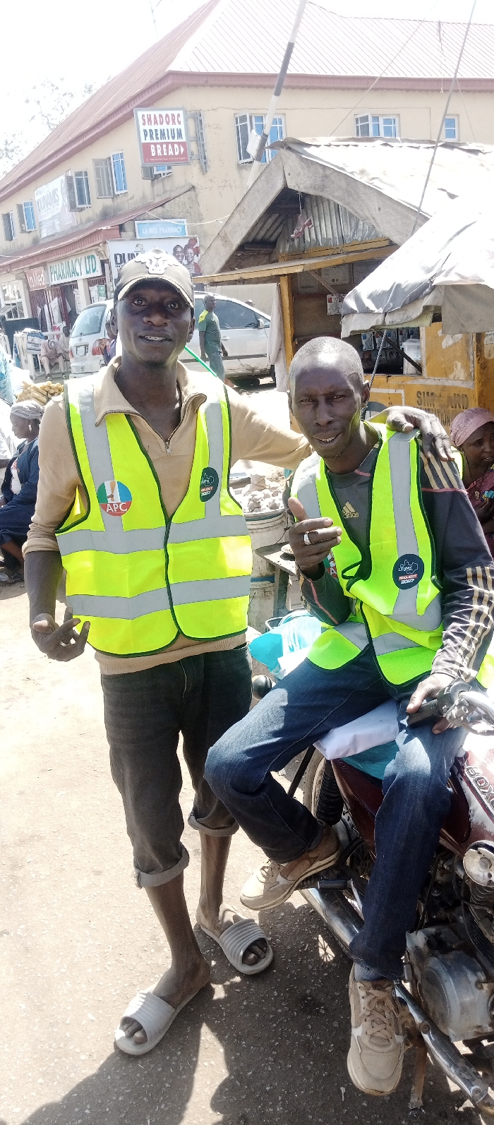 This image captures an outdoor, daytime scene on a busy commercial street at No. 1, Ahmadu Bello Way, Jos, Plateau State, Nigeria, identified by "SIMS PHARMACY LTD" and "SHADORC PREMIUM BREAD" signage. In the foreground, two adult males are posing. The male on the left stands, wearing a beige long-sleeved shirt under a bright yellow-green reflective safety vest. This vest features an "APC" (All Progressives Congress) logo and a "PROJECT 2027" emblem. He wears dark, rolled-up trousers and white ribbed slide sandals, a dark baseball cap, and looks directly at the camera with a slight smile. His right hand is partially raised. The male on the right is seated sideways on a dark-colored motorcycle, wearing a dark long-sleeved shirt under a similar yellow-green reflective vest with a "PROJECT 2027" emblem. He wears blue jeans and light brown sneakers. His left arm is draped over the left male's shoulder, and his right hand forms a thumbs-up gesture, displaying a ring on his right ring finger. He also looks at the camera and smiles. The background features a two-story beige building with a reddish-brown roof, displaying "SHADORC PREMIUM BREAD", "SIMS PHARMACY LTD", and "LA MED PHARMACY" signs. Directly behind the subjects are rudimentary street stalls with corrugated metal and fabric roofs. A white car is visible further back on the street, and other indistinct individuals are present, indicating a populated area. Strong shadows suggest direct sunlight. The ground is paved, appearing as asphalt or concrete.