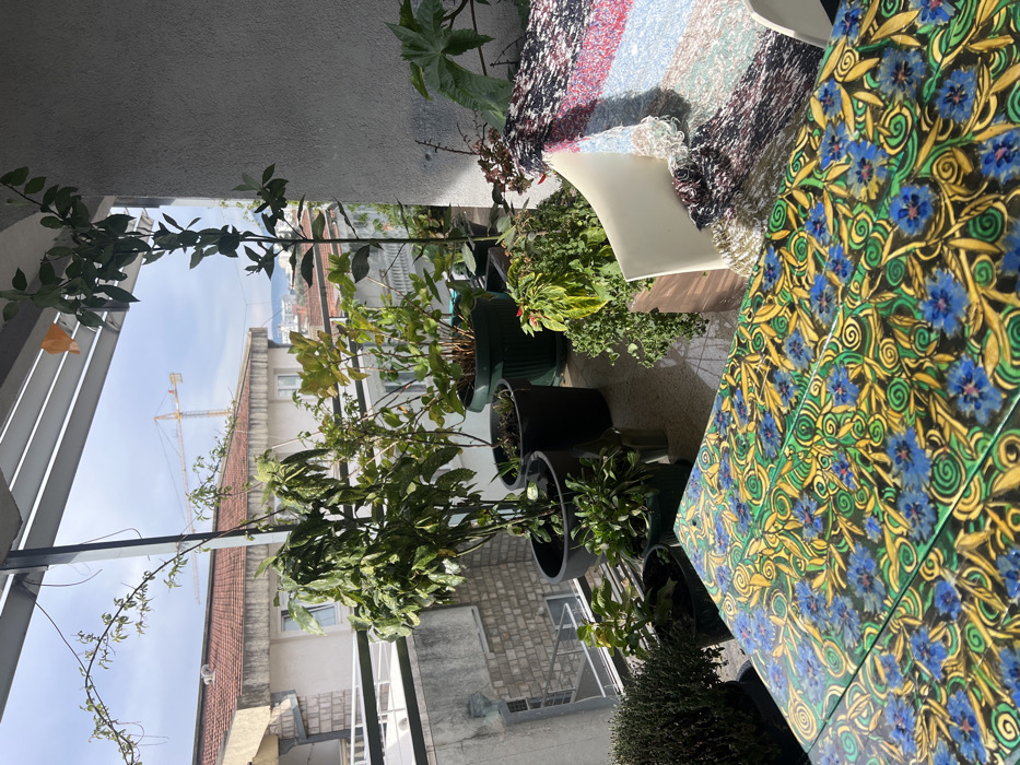 This image captures a daytime scene on a residential balcony in Bar, Montenegro. In the immediate foreground, a rectangular outdoor table displays a distinctive pattern of blue flowers, green leaves, and yellow spiral motifs against a dark background. Partially visible to the right of the table is a light-colored outdoor chair draped with a multi-colored, patterned blanket featuring sections of black, white, red, and blue. The midground is densely populated with numerous potted plants of various sizes and species, contained primarily in black and dark green plastic pots. These plants exhibit a range of foliage, from bushy arrangements to taller, more tree-like specimens. The background reveals an urban landscape under a bright, partly cloudy sky. Multiple buildings with light-colored facades and red-tiled roofs are visible. A prominent yellow construction crane stands tall in the middle distance, indicating ongoing development. Distant hills or mountains line the horizon. The balcony itself features a gray concrete wall on the right and metal railings on the left, with an overhead structural element. Bright sunlight illuminates the scene, casting shadows. No people or active interactions are depicted.