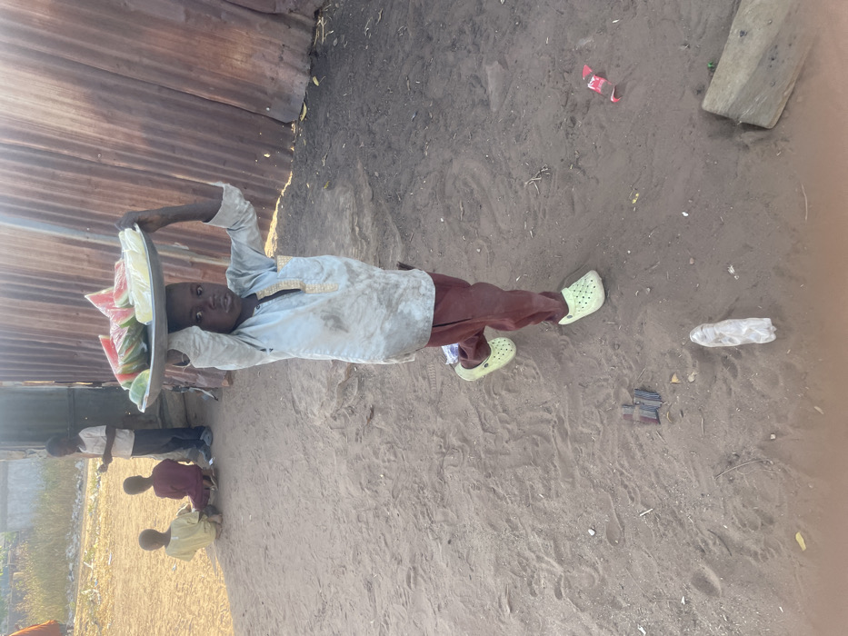 This image captures an outdoor scene in Numan, Nigeria. In the foreground, a young boy, appearing to be of African descent, stands facing forward, carrying a circular metal tray on his head. The tray holds slices of watermelon and other light-colored fruit, possibly lime. The boy wears a light-colored, long-sleeved tunic with a gold-colored pattern on the chest, dark stains on the fabric, and dark red trousers with light green Crocs footwear. His gaze is directed towards the viewer. In the mid-ground, to the left of the central figure, three other children are visible. One child stands near an open dark doorway, while two others are seated on the sandy ground. The ground throughout the scene is composed of reddish-brown dirt or sand, showing various footprints. To the right of the main subject and extending into the background is a weathered, rusty corrugated metal wall or fence. Scattered on the ground near the foreground boy's feet are a crumpled clear plastic bottle, a red and white plastic wrapper, and a small stack of dark, flat rectangular objects. A piece of wood is visible on the far right. The scene is illuminated by bright sunlight, suggesting an outdoor daytime setting.