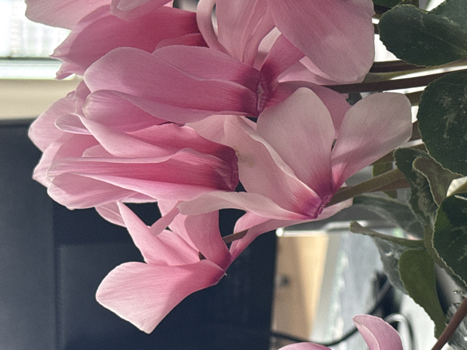 The image presents a close-up, eye-level perspective of a cluster of vibrant pink cyclamen flowers. Multiple blooms dominate the frame, each petal displaying a spectrum from deep rose at the base to a lighter, translucent pink towards the edges, reflexing sharply upwards. Green stems are visible supporting the flowers, and several dark green, variegated leaves with lighter markings and a textured surface are present in the lower foreground. The leaves appear slightly dusty. The background is shallowly focused. To the left, a dark, indistinct rectangular object, consistent with a monitor screen, is visible above a lighter, horizontal surface. To the right, a vertical strip of bright, defused light suggests a window, possibly with blinds or a frame element. The environment is clearly indoor. No individuals, explicit actions, or interactions are depicted. The specific location within Sofia, Bulgaria, cannot be ascertained from the visual evidence contained within the image.
