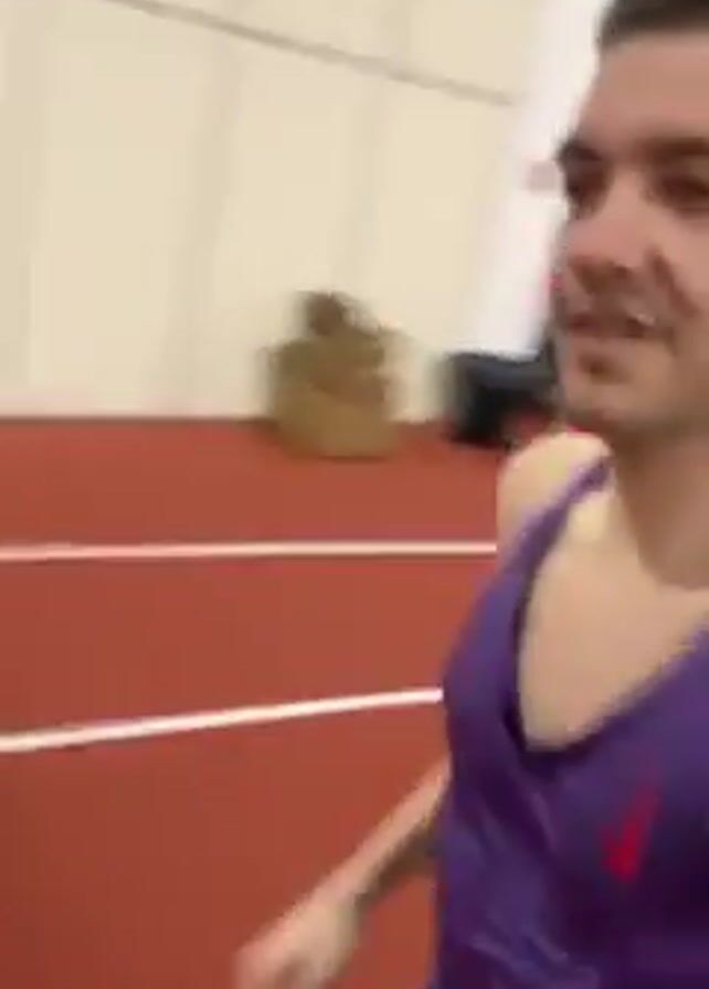 A man wearing a purple athletic tank top runs on an indoor track. The track is red with white lines. There are rows of red, blue, and orange seats visible in the background. There are also weight training machines and posters along the wall. The man appears to be recording himself while running.