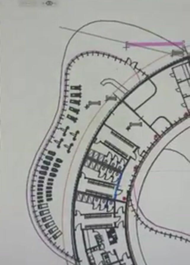 A computer screen displays architectural plans in an overhead view. The image zooms out to show a layout of rectangular blocks forming a grid, some colored gray, red, and blue. One block contains a circular, swirling architectural design. The screen title shows the word "axonometry" in a non-English language. The sound of music is present in the video.