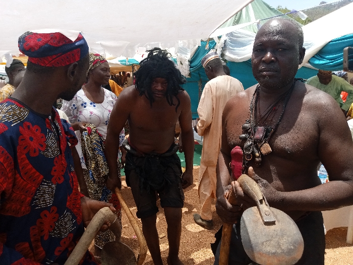 four men in front of a white tent in a village or town in Zum, Nigeria. The man on the left is wearing a blue and red patterned shirt with a red and black cap. He is holding a wooden stick in his right hand. The man in the center, with a long, dark beard, is wearing a dark loincloth and holding a wooden stick in his right hand. The man on the right is shirtless and holding a large, rusted hoe in his right hand. He is wearing several necklaces around his neck. The man behind the one on the right is wearing a white long-sleeve shirt and white pants. He is holding a staff in his right hand. The ground is dirt and there are trees in the background.