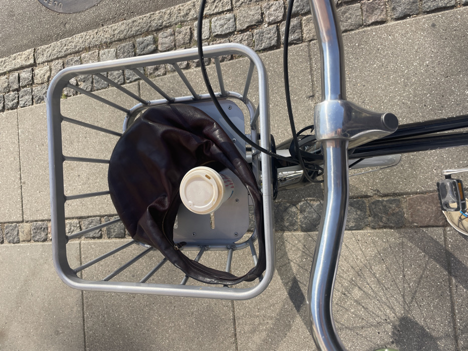 The image displays a high-angle view of the front section of a bicycle parked on a paved surface in Frederiksberg, Denmark. A rectangular, silver-colored metal wire basket is mounted at the front. Inside the basket, a dark brown, soft-textured leather bag is casually placed, occupying most of the space. Adjacent to the bag, a white disposable coffee cup with a light-colored lid stands upright, displaying faint red and white vertical stripes on its lower portion. Chrome handlebars are visible across the bottom of the frame, with black control cables extending from them towards the basket. A bicycle pedal with a light-colored shoe is partially visible on the lower left. The ground consists of light grey pavement bordered by a strip of darker, irregular cobblestones. The scene is illuminated by strong sunlight, casting distinct shadows of the bicycle components onto the ground.