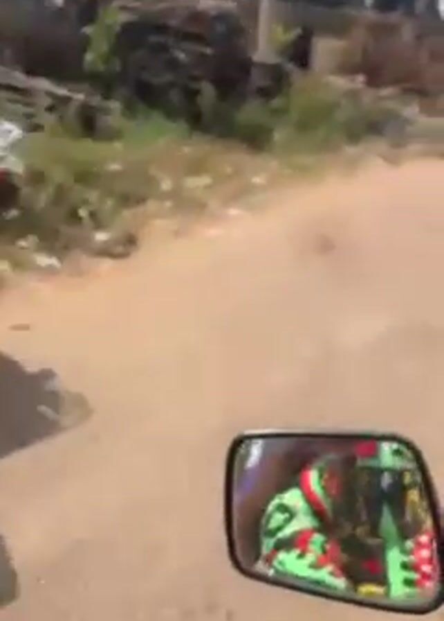 person riding a scooter down a dirt road in what appears to be a rural or suburban area. The road is uneven and has debris scattered along the sides. The scooter has a sticker of the Manchester United logo on the front. The rider's clothing is visible in the side mirror, showing a colorful patterned shirt. The environment includes buildings, vegetation, and utility poles. The sky is overcast. The scooter is moving forward along the road.
