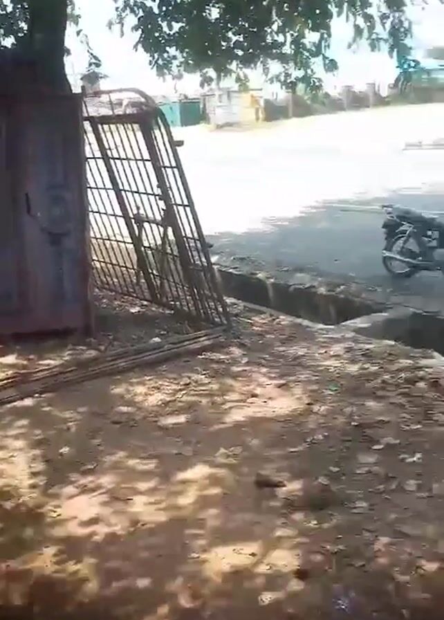 n outdoor scene next to a road. In the foreground, there is a patch of dirt under a tree, with scattered leaves and debris. Several metal objects, including a door and some gates, lean against each other. A ditch runs along the edge of the road. On the other side of the ditch, a black and silver motorcycle is parked on the side of the road. In the background, there are buildings and trees, and a motorcycle drives by. The sky is overcast.