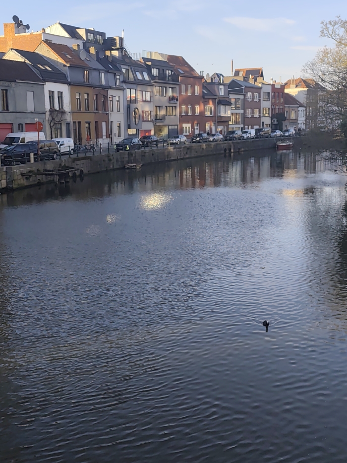 This image presents an urban canal scene in the city of Ghent, Belgium, viewed from a slightly elevated vantage point