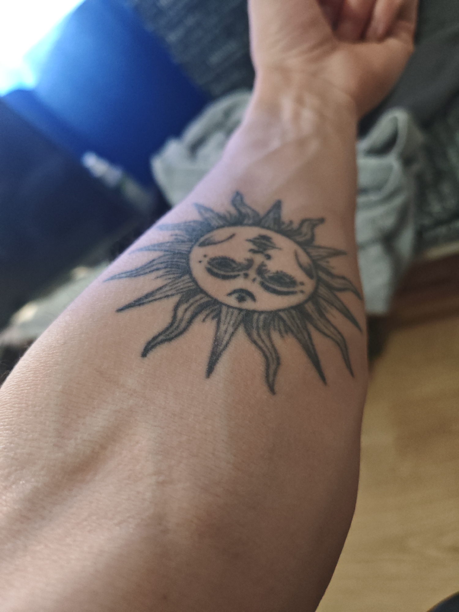 An arm with a tattoo of a sun with a human face is visible in the image