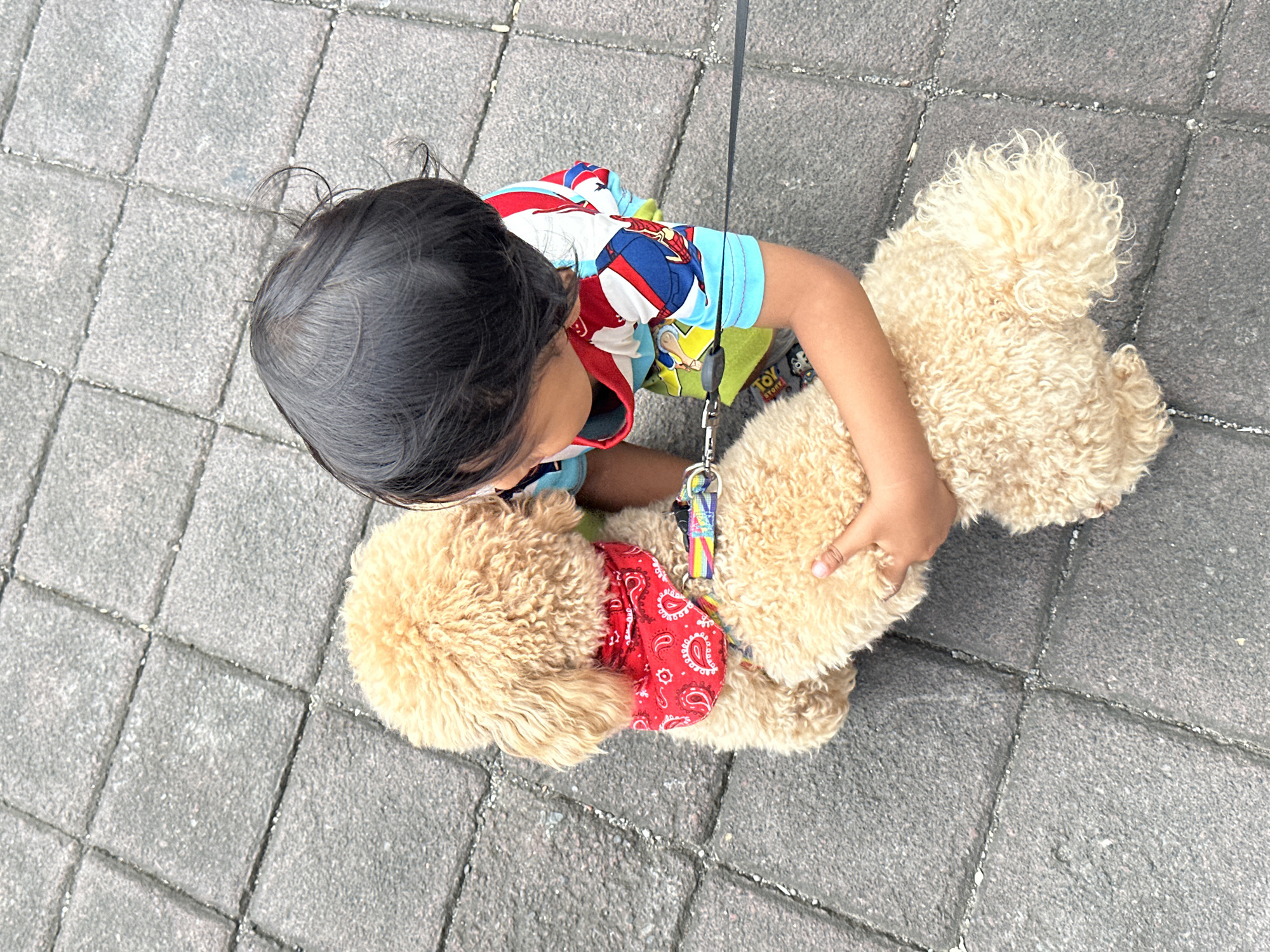 - "A high-angle forensic shot depicts a child embracing a small dog on a paved surface in Buduk, Indonesia" by FM-DnMzO2, licensed under CC BY 4.0