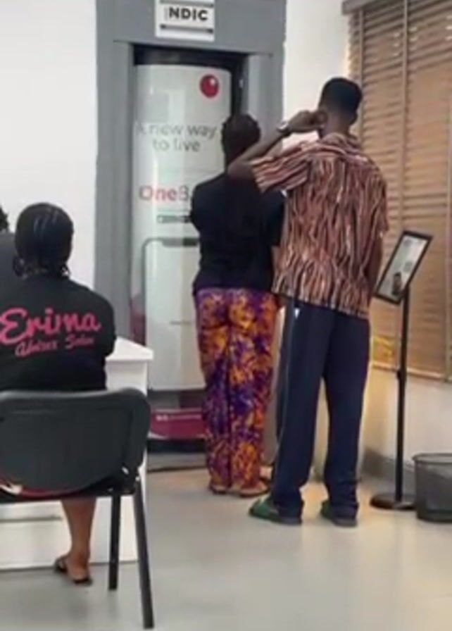 interior of a brightly lit business, possibly a bank, featuring three individuals. One woman, wearing a black shirt and colorful patterned pants, enters what appears to be an automated teller machine room. A man stands beside the entrance, clad in a patterned shirt and dark pants, seemingly watching her. Another woman sits at a desk in the foreground wearing a t-shirt that reads "Erima Unisex Salon", suggesting she is an employee. The ATM room has the sign "NDIC" above the doorway. Behind the woman at the desk, there is a sign on an easel. The overall atmosphere seems calm and orderly.