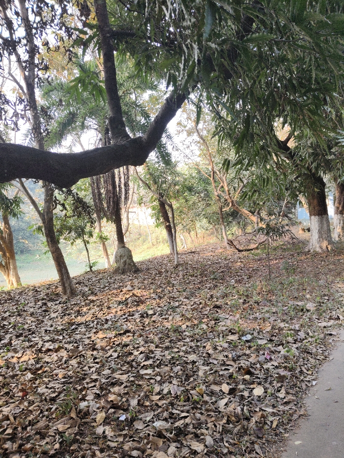 The image depicts a semi-wooded area in Bardhaman, India. The foreground and midground are covered extensively with a dense layer of dry, brown fallen leaves. Numerous trees are visible throughout the scene, varying in trunk thickness and foliage density. A prominent, thick, dark-barked tree branch extends horizontally from the upper left across the center of the frame. Several tree trunks show patches of white paint near their bases. Green foliage is present on multiple trees, particularly dense in the upper right quadrant. The ground slopes upwards towards the background. A narrow, dark grey paved surface or path is visible along the right edge of the frame. Sunlight filters through the tree canopy, illuminating parts of the leaf-covered ground. No individuals or animals are present. Small pieces of light-colored litter are scattered among the leaves in the foreground.