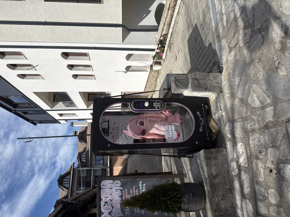 The image displays an outdoor scene in Bansko, Bulgaria, under a clear sky with scattered cirrus clouds. A black vending machine, featuring an oval transparent front panel, stands in the foreground. Inside, a large pink plush toy, resembling the character Angel from Lilo & Stitch, is displayed. Text on a sticker inside the machine indicates pricing for games: "1 euro 1 game" and "2 euro 3 games." The machine's right side includes a coin slot, control buttons, and a digital display. The bottom of the machine is labeled "Pink Time" and is propped up by wooden blocks. The ground in the immediate foreground consists of irregular stone paving. The vending machine is situated between two low, grey stone walls. To the left, a small coniferous tree in a dark wooden barrel planter is visible. Behind it stands a large, black chalkboard sign with text in Cyrillic, advertising a "Механа" (tavern) and listing items such as "СУПИ" (soups), "САЛАТИ" (salads), and "ЯСТИЯ" (dishes). Further left, traditional Bulgarian buildings with brown tiled roofs and balconies are present. To the right of the vending machine, a modern, multi-story white building with arched windows, black-framed balconies, and a dark-clad upper floor is visible. A paved alleyway extends into the background between the buildings, where additional potted plants are situated. A tall, slender metal pole with an antenna-like structure extends upwards from behind the vending machine. The scene is illuminated by daylight, casting shadows on the paved surfaces. No individuals are present.