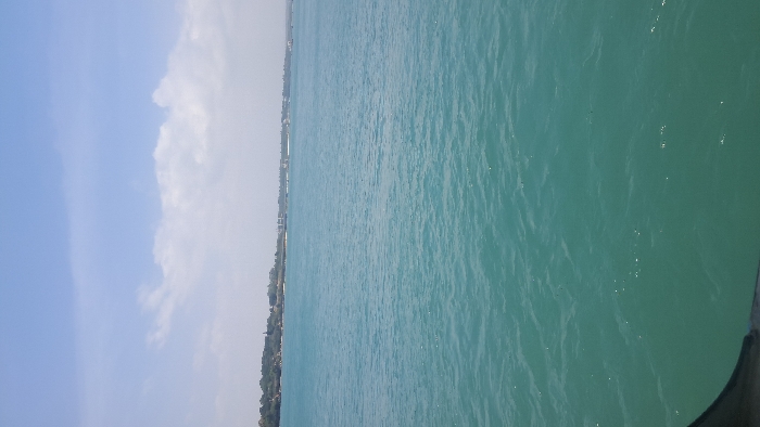 The image displays an expansive view across a body of turquoise-colored water, identified as Kilindini Harbour, observed from the Ganjoni/Shimanzi ward in Mombasa, Kenya. The foreground is dominated by the water's surface, which exhibits minor ripples and glints of light. A dark, curved, indistinct object is partially visible in the bottom-left corner, suggesting the edge of a vessel or platform from which the image was captured. In the middle ground, a distant landmass stretches across the horizon. This landmass features a coastline with significant green vegetation, indicative of trees or dense foliage, particularly towards the left. Scattered along the coastline are several man-made structures: a distinct light-colored building with a visible roofline on the far left, and further right, a multi-span bridge or causeway structure. The background consists of a clear, light blue sky with scattered white cumulus clouds, occupying the upper portion of the frame. No human figures, animals, or specific actions are discernible within the scene.