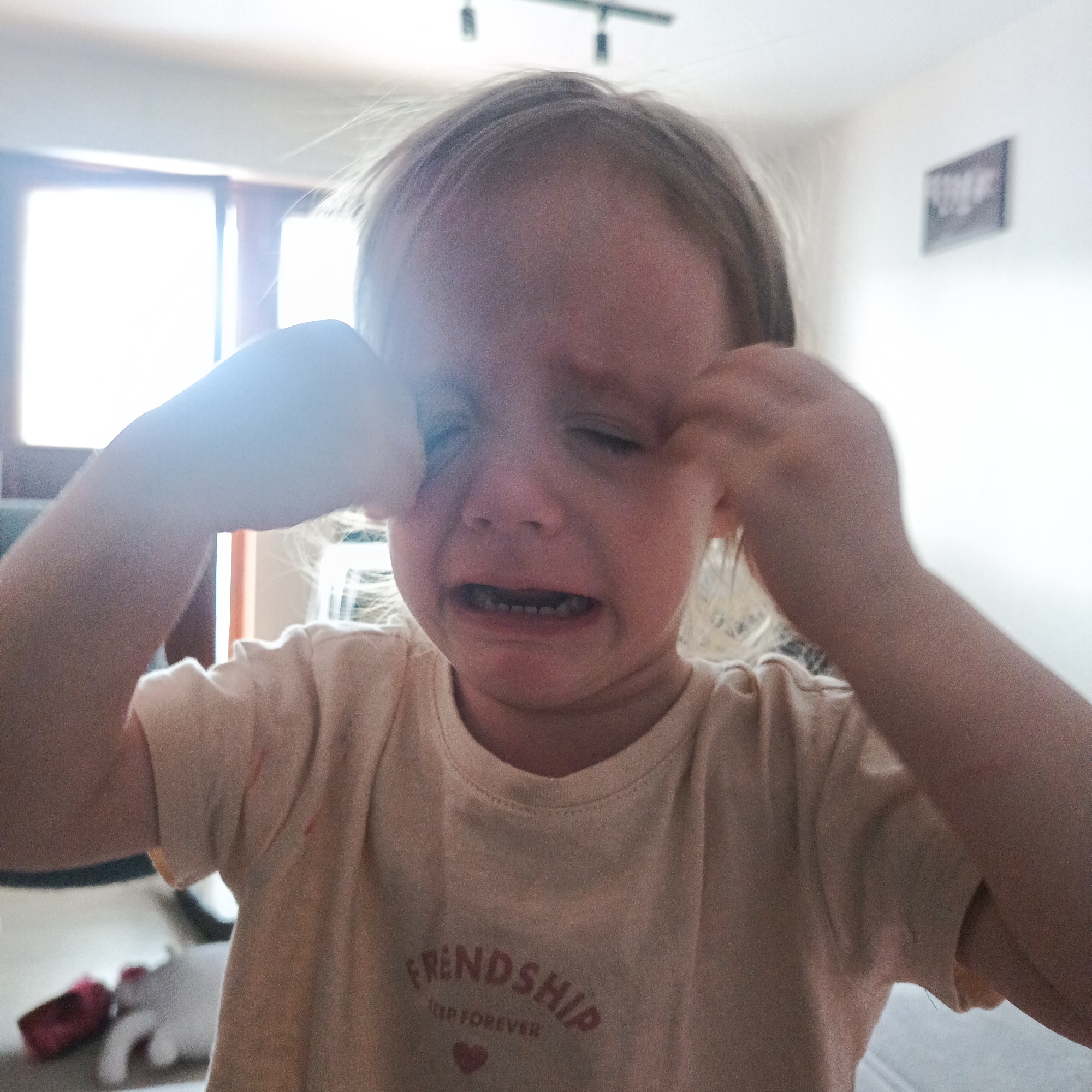 A young child with blonde hair is crying, with their hands raised to their eyes