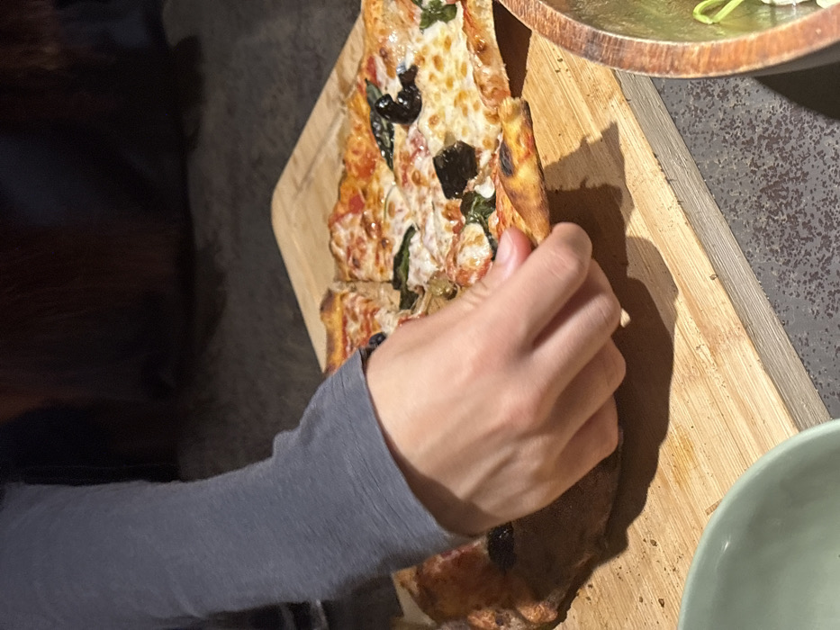 An overhead, slightly angled image depicts a scene located in the city of Ness Ziona, Israel. A pale-skinned left hand, extending from the upper left, is shown gripping and lifting a triangular slice of pizza from a light-colored wooden serving board. The hand is covered by the sleeve of a grey long-sleeved garment. The pizza is rectangular in overall shape, topped with melted white cheese, red sauce, green basil leaves, and irregularly shaped black olive pieces. Its crust exhibits a well-baked appearance with some darkened, possibly charred, sections. The wooden board rests on a dark, textured surface, likely a table. A portion of a light green ceramic bowl is visible in the lower left corner. The background is dark and out of focus, indicating an indoor, dimly lit environment.