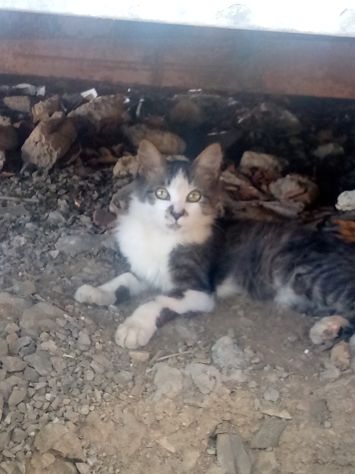 A long-haired cat lies on a patch of rocky ground, appearing mostly white with grey and brown markings on its face, back, and tail. It's under the edge of a wall or structure, partially obscured by rocks and debris. The cat has yellow eyes and a quizzical expression, looking upward. The area is dimly lit, suggesting the cat is in a shady or sheltered spot.