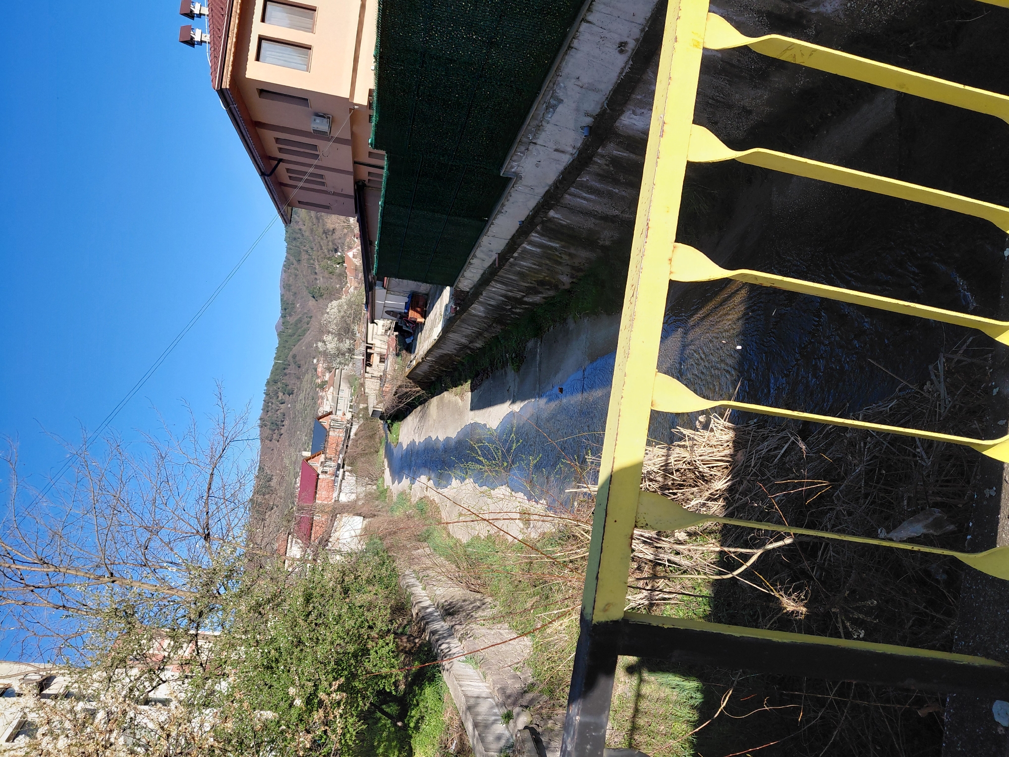 The image depicts a view in Bratsigovo, Bulgaria, looking along a narrow, concrete-lined canal or stream. A yellow metal railing is visible in the foreground on the right side of the frame. The canal runs between buildings on one side and a vegetation-covered bank on the other. The canal's flow is dark and rippled. Beyond the vegetation are houses with red-tiled roofs and a distant mountain in the background. The sky is a clear blue. The image is oriented vertically, giving a sense of depth and perspective along the canal.