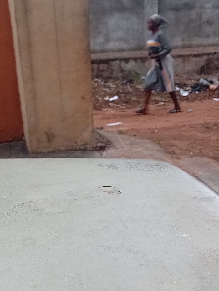 A blurred image shows an elderly woman walking in the background on a dirt path near a building. She is wearing a long dress and a head covering. The ground is littered with debris. In the foreground, there is a damaged, light-colored surface, possibly a rooftop or table. The surface has a noticeable hole and peeling paint. The focus is soft, making the details difficult to discern.