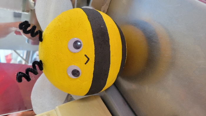 A whimsical yellow and black striped bee craft with googly eyes and a tiny "smile" sits nestled within a large, possibly metal, fan