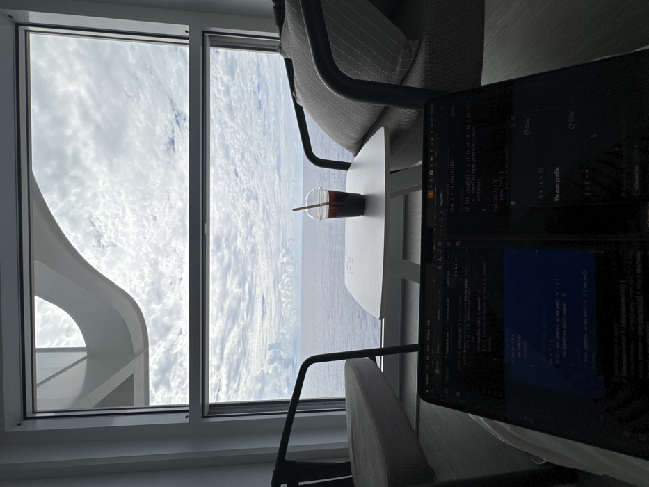 The scene depicts an interior view from a vessel at sea, within the vicinity of Unknown, Bahamas. In the immediate foreground, the lower portion of an open laptop computer is visible, its screen displaying dark-themed programming code across multiple panes, including a chat interface (labeled "ChatGPT") discussing postfix notation. Centered in the midground is a small, white, square-top table with a single pedestal base. Resting on this table is a clear plastic cup containing a dark liquid, presumably iced coffee, and fitted with a light-colored straw. Flanking the table are two chairs with dark frames and grey upholstered cushions; the chair on the right also features a patterned grey pillow. The background is dominated by a large, multi-pane window that offers an unobstructed view of the open ocean under a partially cloudy sky. The ocean surface appears calm with subtle ripples, extending to a distant horizon. Above the lower window frame, a prominent white, curvilinear architectural structure, consistent with a ship's superstructure, is visible against the sky. No individuals are present in the frame.