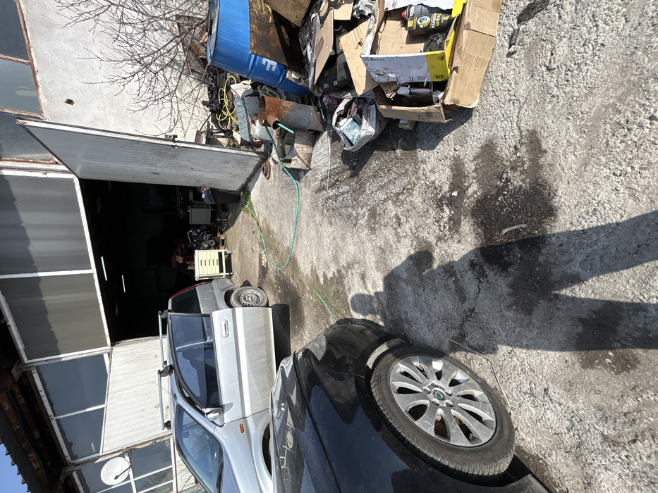 The scene depicts the exterior of an automotive workshop or garage in Plovdiv, Bulgaria, on a clear, sunny day. A large industrial-style building with multiple bay doors, one of which is open, occupies the background. Mounted on the building's left side is a white satellite dish. In the foreground, the front passenger side of a black vehicle, identified by a Skoda-branded wheel hubcap, is partially visible. Immediately behind it, a silver two-door Honda HR-V with roof rails is parked, facing the open garage door, its driver's side door ajar. A human shadow, cast by the photographer, stretches across the concrete ground from the immediate foreground towards the garage entrance. The ground is stained, uneven concrete with visible tire tracks and wet patches. A green garden hose snakes across the ground, leading towards the garage. To the right of the open garage door, an accumulation of discarded materials includes cardboard boxes containing various items, such as motor oil bottles (one labeled "CASTROL"), metal scraps, and what appears to be a section of an exhaust pipe. A large blue barrel is visible behind this pile of debris, and a leafless tree or large bush stands on the far right. Inside the open garage bay, a person is visible near a white, multi-drawer tool cart, appearing to work on an engine block or similar component. Overhead, interior fluorescent lights are illuminated.