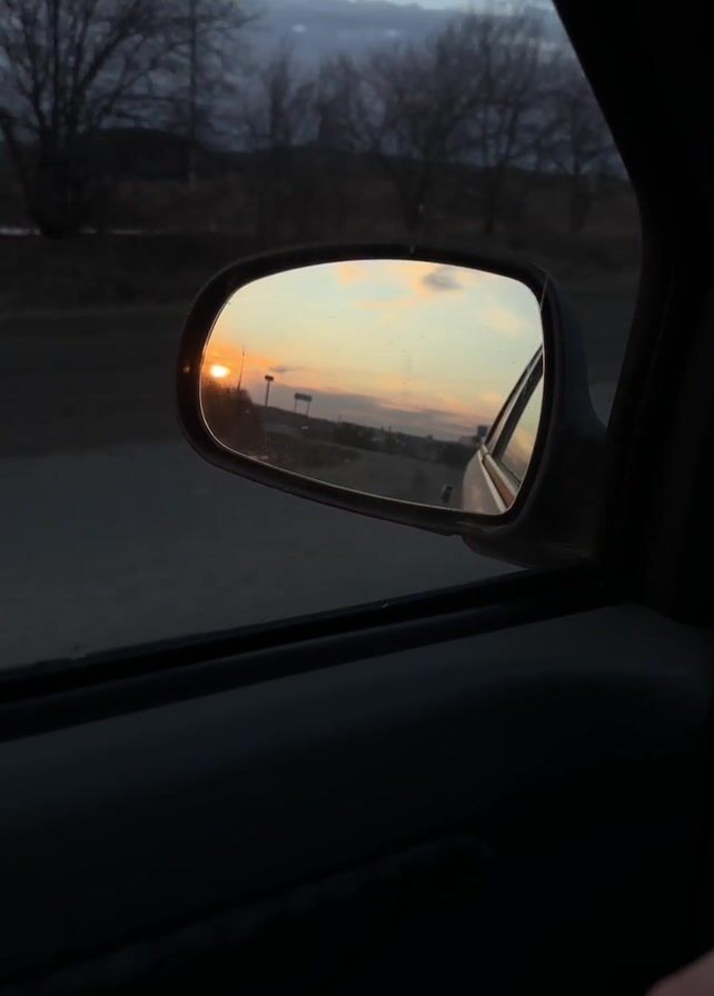 The video depicts the view from the interior of a vehicle moving along a road at dusk. The sunset is visible in the car's side mirror. The landscape outside consists of bare trees, utility poles, and distant buildings under a cloudy sky. The interior of the car is dark, emphasizing the sunset reflected in the side mirror. There is audio of someone singing, and music playing.