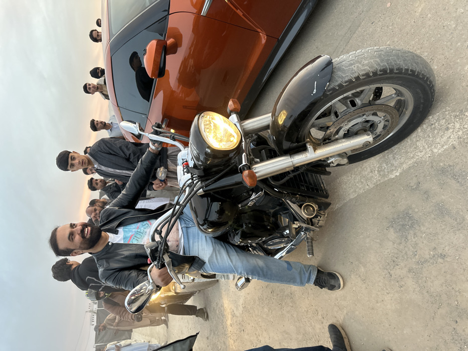A man sits on a black motorcycle, smiling with a crowd around him. The motorcycle's headlight is on. An orange car is parked closely behind. The background features a hazy sky and a paved ground where the group stands. The scene appears to be outdoors.