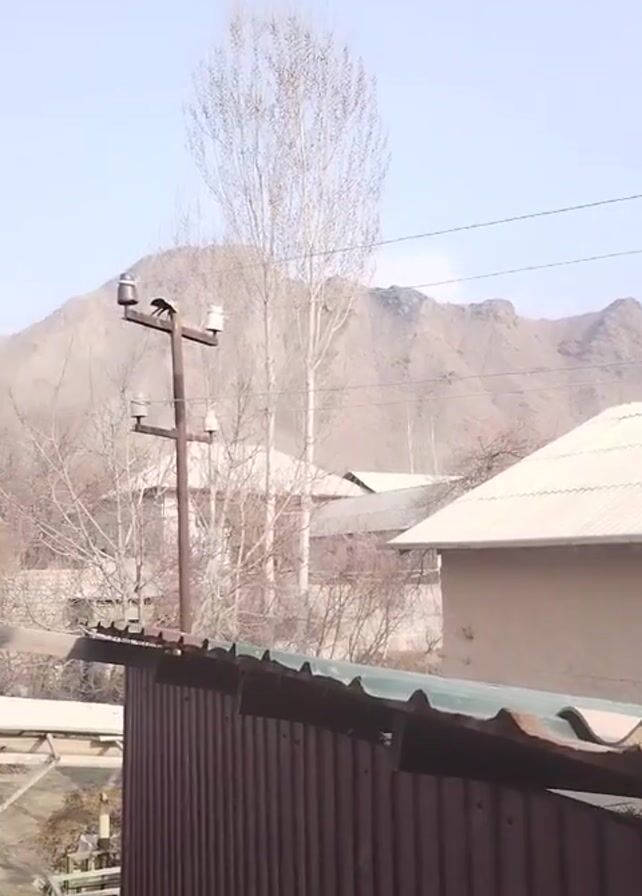 The video depicts a rural landscape in what appears to be early spring. In the foreground, there's a rusty corrugated metal fence. A utility pole with electrical insulators is visible behind the fence, with a bird perched on top. Beyond the fence and utility pole are several buildings with corrugated metal roofs, typical of rural or suburban dwellings. In the middle ground, there is a budding tree with small pink flowers amidst leafless trees and bushes, suggesting the start of spring. In the background, a range of rugged mountains is visible, partially obscured by a light haze. The sky is a pale blue, indicating a clear day. The overall scene suggests a quiet, undeveloped area with a hint of spring growth amidst an otherwise barren winter landscape.