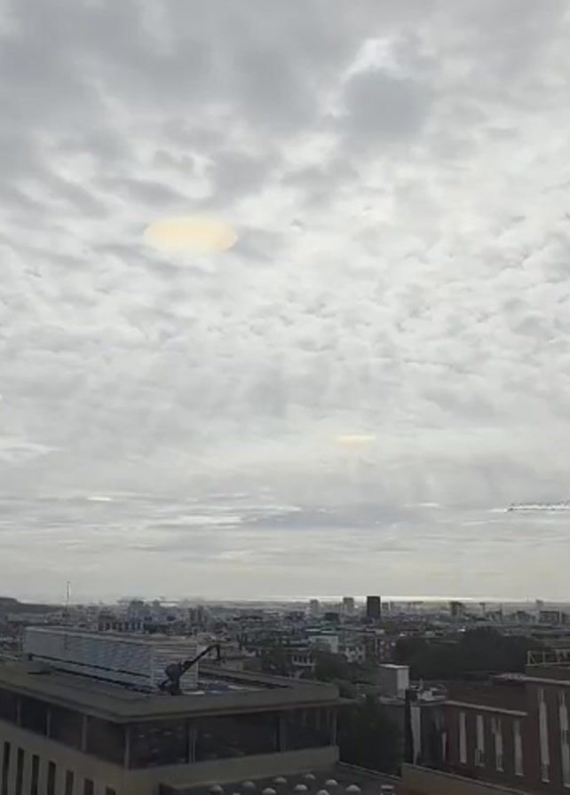 The view from a high vantage point overlooks a cityscape under a cloudy sky. The cityscape consists of various buildings, ranging in height and architectural style. A body of water is visible in the distance. Several buildings are in the foreground, close to the camera's vantage point, while other buildings stretch out to the horizon. A construction crane is visible towards the right of the frame. The sky is covered in clouds. The light fixtures on the ceiling are visible as bright circles in the sky.