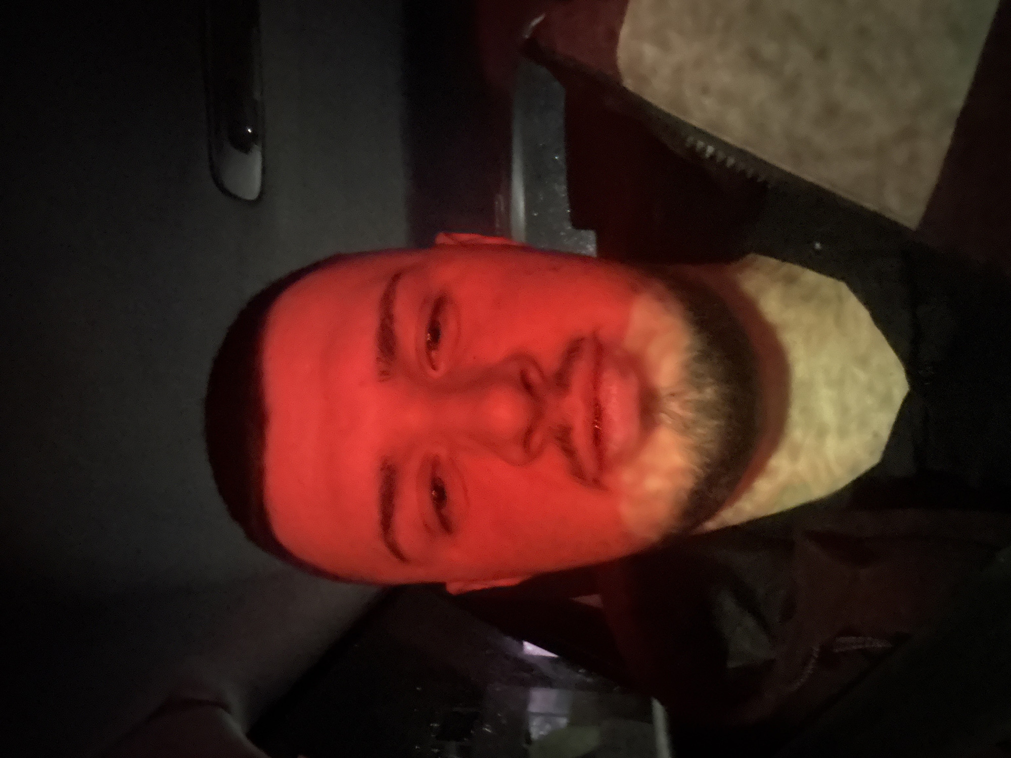 A man's face is illuminated in red light. He has a short, dark haircut and a beard that is lighter in color, particularly near his chin. The red light gives his skin an intense red hue. He appears to be indoors, possibly in a car, given the dark interior with a visible door handle. He is wearing a dark garment, possibly a jacket, and the background is dark and somewhat obscured. The image is rotated, appearing sideways. There is no evidence of location in Sofia, Bulgaria in the given image.
