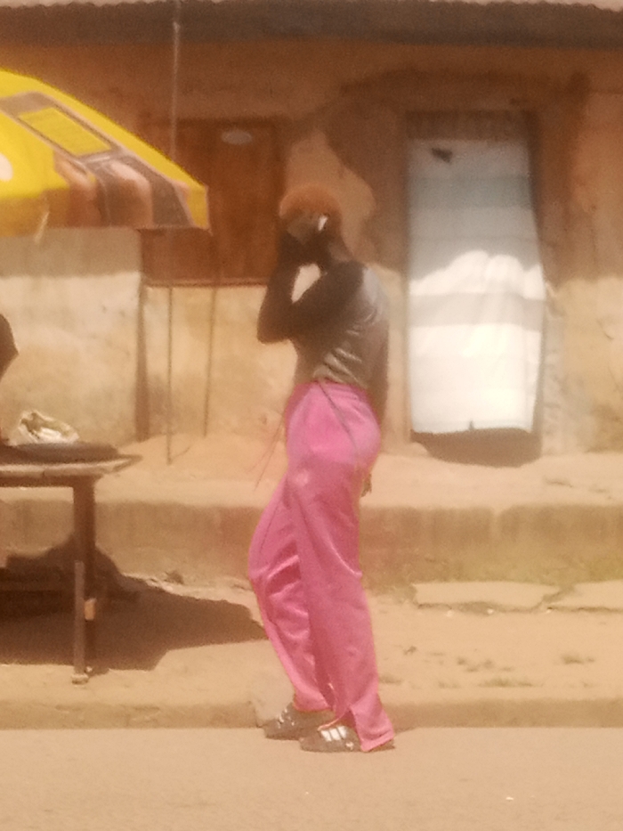 The image captures an outdoor scene in Television, Nigeria, under bright daylight conditions. In the mid-ground, a dark-skinned individual walks from left to right, wearing a light grey short-sleeved top, bright pink trousers, dark sandals with white accents (possibly Adidas branding), and a light brown cap. The individual holds a dark object, consistent with a mobile phone, to their right ear, suggesting a phone conversation. To the left, a yellow umbrella is partially visible, open and displaying black and white striped sections along with graphics resembling a mobile phone advertisement. Beneath the umbrella, a dark-colored table is present, with a light-colored, amorphous object resting on its surface. The background consists of a light brown building wall, exhibiting texture and signs of wear. A white door, or a light-colored covering over an opening, is visible on the right side of this background structure. The ground appears to be an unpaved, light brown dirt or sand surface. Thin, dark lines, potentially utility wires, extend diagonally from the upper central area towards the mid-ground. Shadows are cast by the primary figure and the table, indicating a high sun position.