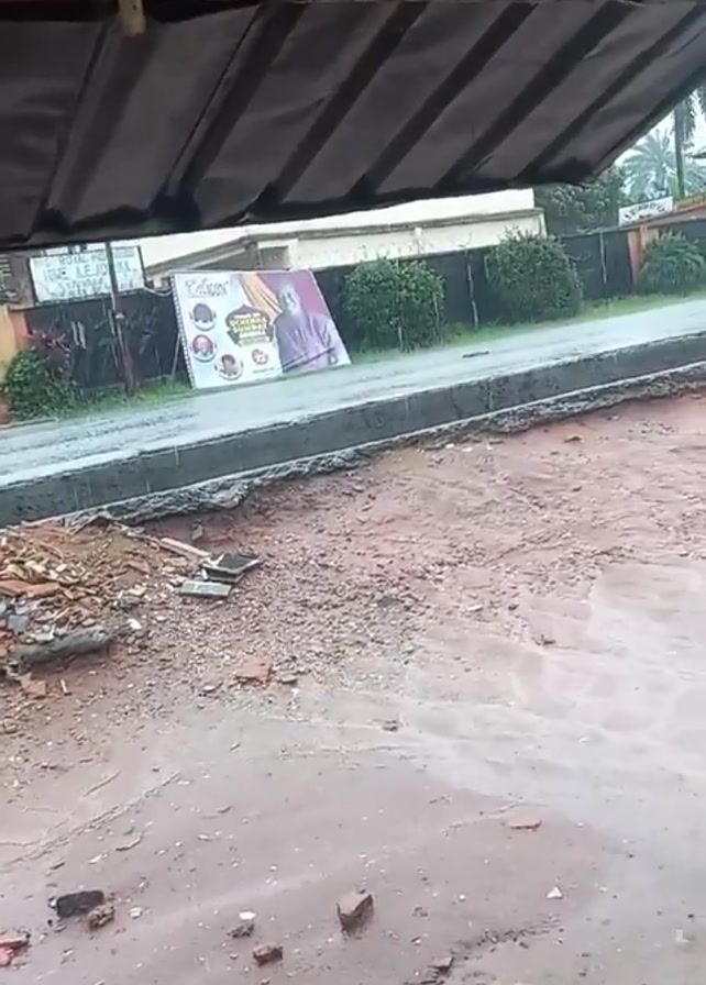 The video depicts a rain-soaked street or roadside area, viewed from under a covered shelter. The ground is muddy with scattered pieces of brick and rubble. A partially-visible sign advertising an event or campaign stands on the far side of the street. Rain is falling, creating a murky flow across the surface. The scene suggests recent construction or damage in an area affected by heavy rainfall.