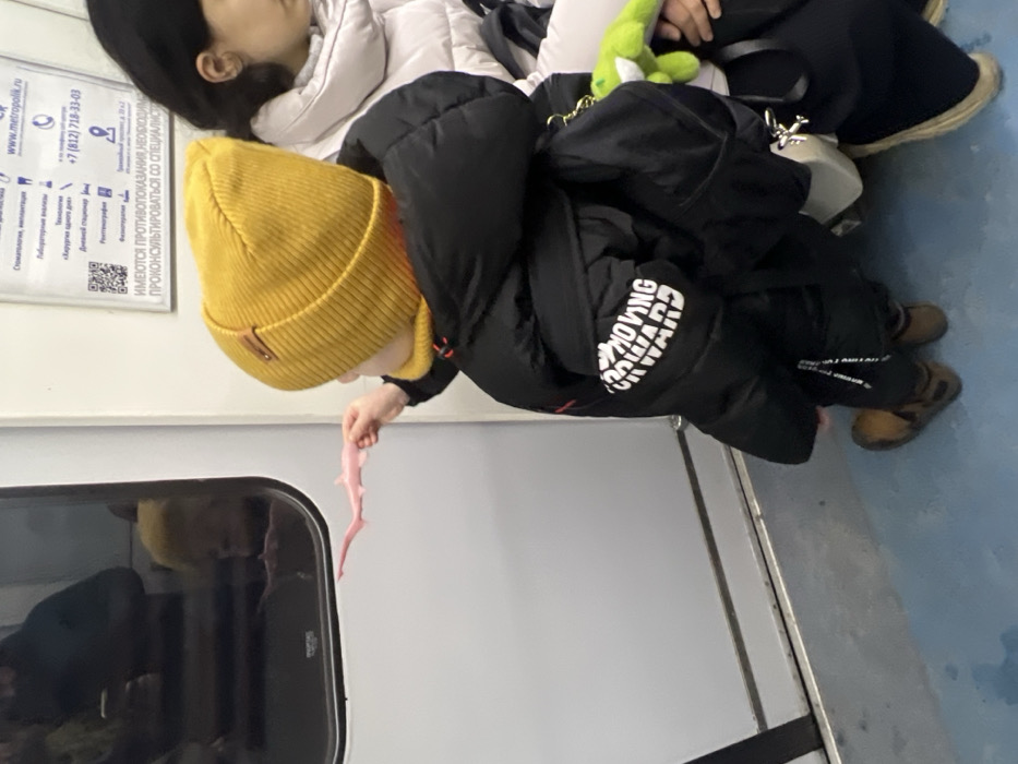 - "Inside a public transit car, a child wearing a yellow beanie, black puffy jacket, and brown shoes holds a pink rubber shark toy" by FM-4Mf512, licensed under CC BY 4.0