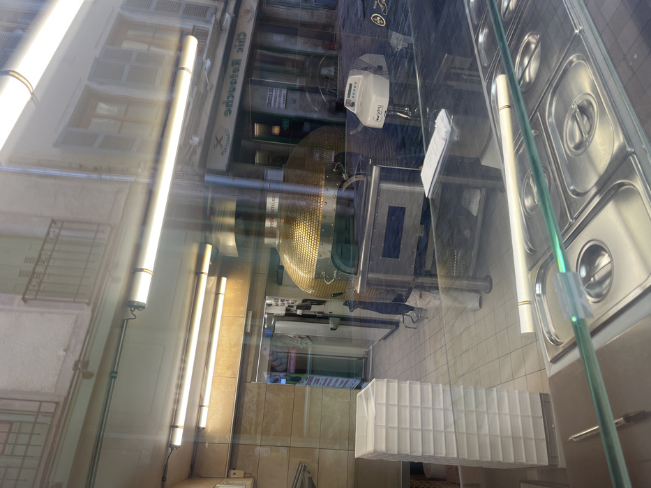 The image depicts the interior of a pizza establishment, viewed through a reflective glass window that shows a street scene in Le Puy-en-Velay, France. Inside the establishment, the foreground features a stainless steel preparation counter containing multiple rectangular metal compartments, likely for food ingredients, partially shielded by a glass sneeze guard. A long white cylindrical object rests horizontally on this glass barrier. A black pen is visible on the counter surface. To the left, a vertical stack of approximately fourteen white, rectangular plastic containers is positioned. Centrally, a large, dome-shaped pizza oven with a golden-brown, textured exterior and a stainless steel front opening is visible, resting on a stainless steel base. A substantial stainless steel ventilation hood is mounted above the oven. Adjacent to the pizza oven, a rectangular stainless steel commercial unit, possibly another oven or prep table, stands. To the right, a white VMI brand commercial machine, likely a dough mixer or slicer, with a digital display, is situated on a counter alongside a white sheet of paper. The background reveals an open doorway leading to a tiled rear area, where commercial refrigeration units are partially discernible. The interior is illuminated by several linear fluorescent strip lights, and the walls and floor feature light-toned surfaces. Reflected on the glass are elements of an urban street scene in Le Puy-en-Velay. An opposing building facade with a light-colored stucco finish, traditional green-shuttered windows, and a wrought-iron balcony is visible on an upper floor. Below, a commercial storefront is reflected, clearly displaying the reversed green lettering "Chic Retouche," along with "X Creation" and "Confection," indicating an alteration or tailoring shop. No individuals are visible within the pizza establishment or in the reflected street scene.