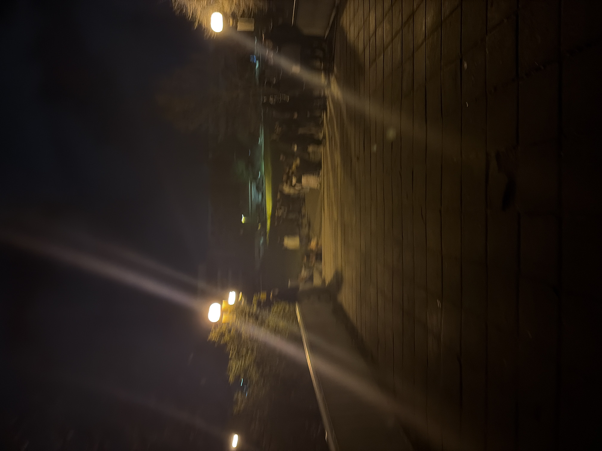 night scene in what appears to be Sofia, Bulgaria. The perspective is along a pedestrian walkway with vertical wooden planks forming a wall to the right. Streetlights illuminate the path, casting bright lines of light. Across the walkway, there are hints of trees and people in the distance. The overall lighting suggests it is dark, with the streetlights providing the main source of illumination.