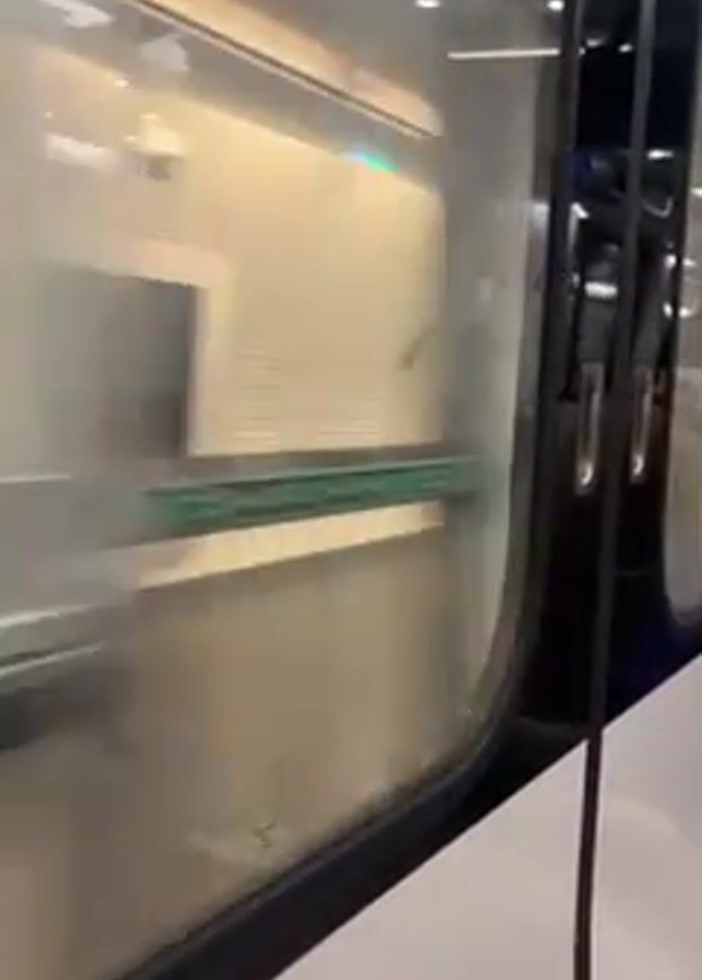 view from inside a train car as it passes through a station