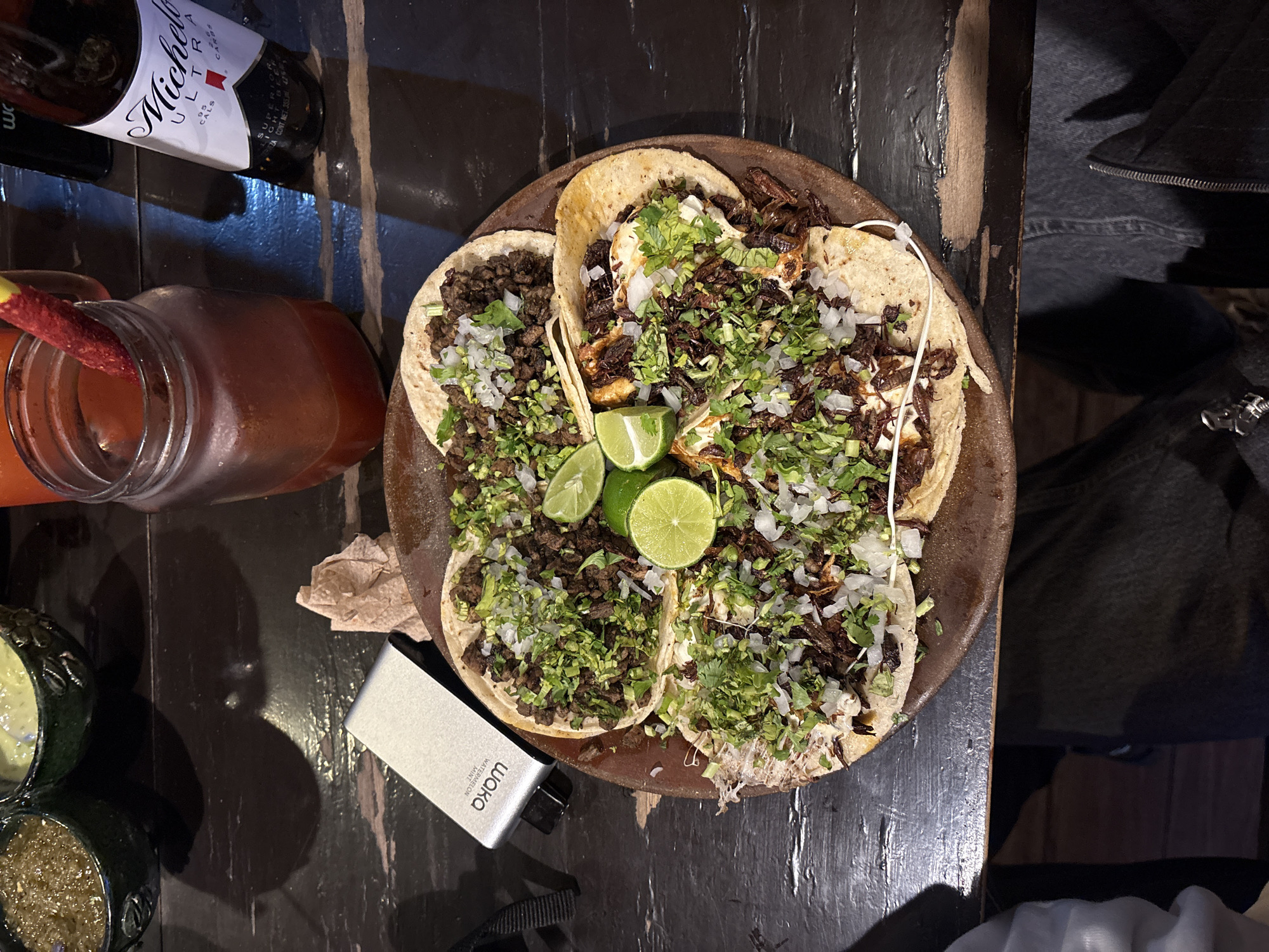 - "Here is a description of the image: The image shows a platter of tacos on a dark wooden table in what appears to be a restaurant or bar setting" by FM-yooU93, licensed under CC BY 4.0