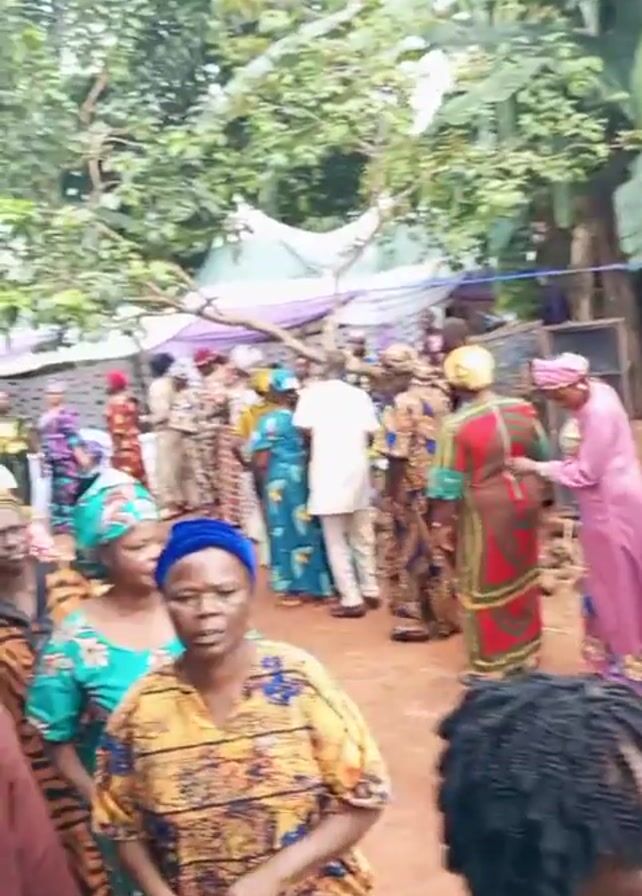 The video captures a lively outdoor gathering with a mix of people, mostly adults, dressed in colorful traditional African clothing