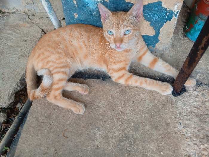 A domestic short-haired cat with orange tabby markings and light blue eyes is observed lying on a light gray concrete surface. The animal is positioned facing forward, with its front paws extended; its right paw rests against a dark, vertically oriented rusted metal bar. The concrete ground displays irregular textures and multiple cracks, particularly in the upper left area. A slender, curved, brown invertebrate-like object is visible on the concrete near the cat's rear left leg. In the background, to the left of the cat, an aged structural element or wall, painted light blue with significant areas of chipped paint, is present. A white cylindrical object is visible leaning against or affixed to this blue surface. To the right of the cat, a partially obscured, blurry object with blue, green, and red coloration is visible behind the rusted metal bar. Small patches of green vegetation are discernible along the edge of the concrete in the lower left. The scene is located in Tinaquillo, Venezuela.
