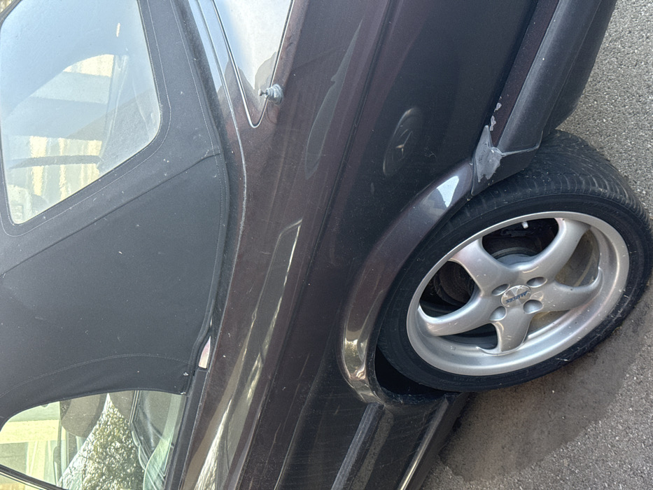 - "The image displays the rear-right quarter of a dust-covered, dark metallic burgundy convertible vehicle, situated in Očinići, Montenegro" by FM-hkxCe2, licensed under CC BY 4.0