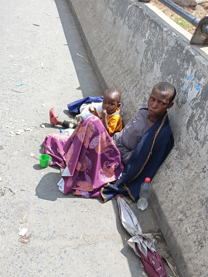 - "The image depicts two individuals, an adult and a young child, seated on a paved surface next to a concrete barrier in Nairobi, Kenya" by FM-c1BvP2, licensed under CC BY 4.0