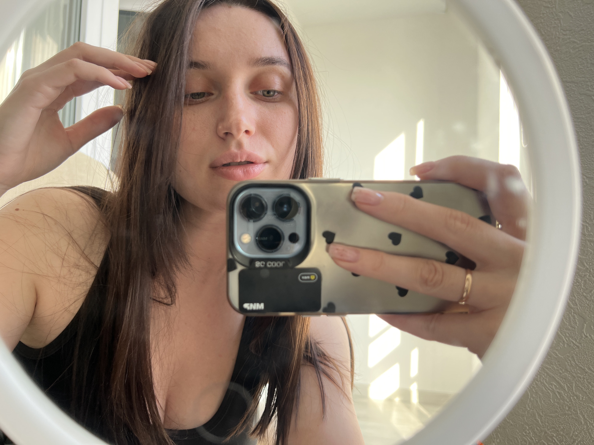 A woman with long brown hair is taking a selfie in a round mirror. She is wearing a black tank top. She is holding a phone with a light-colored case decorated with black hearts, and she has a gold ring on one finger. The reflection in the mirror shows a bright interior space with light coming through a window. The city of Tyumen, Russia, is not discernible from the provided image.