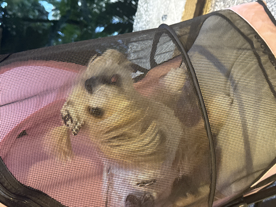 A small, light-furred dog, possibly a Maltese or similar breed, is contained within a pet stroller or carrier