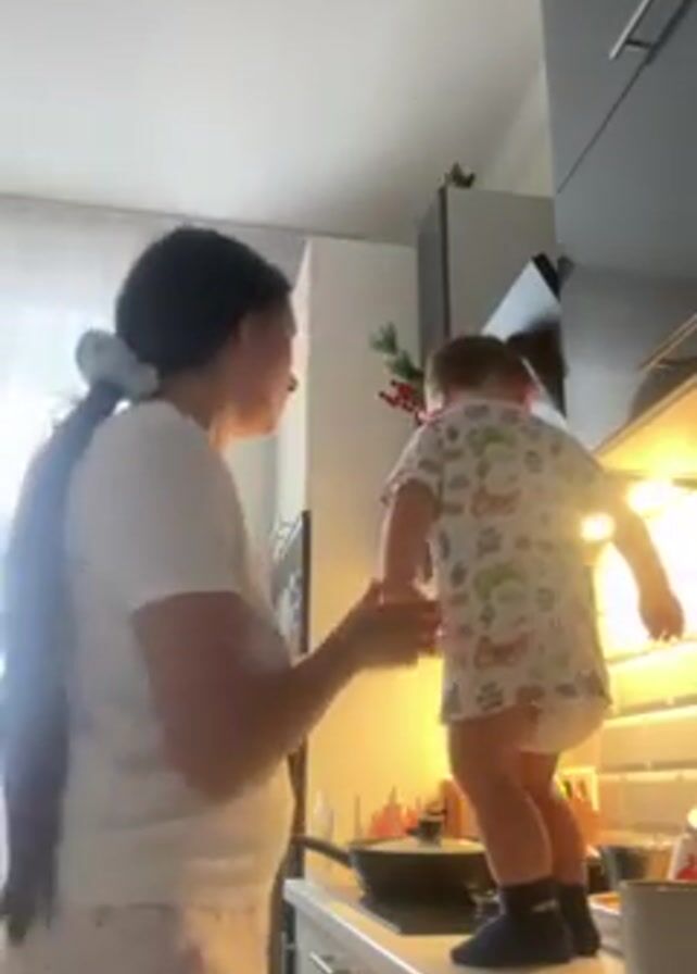 A woman in a white shirt and pajama pants holds a toddler wearing a printed onesie and dark socks, standing on a white kitchen counter next to a black stovetop with a pan on it