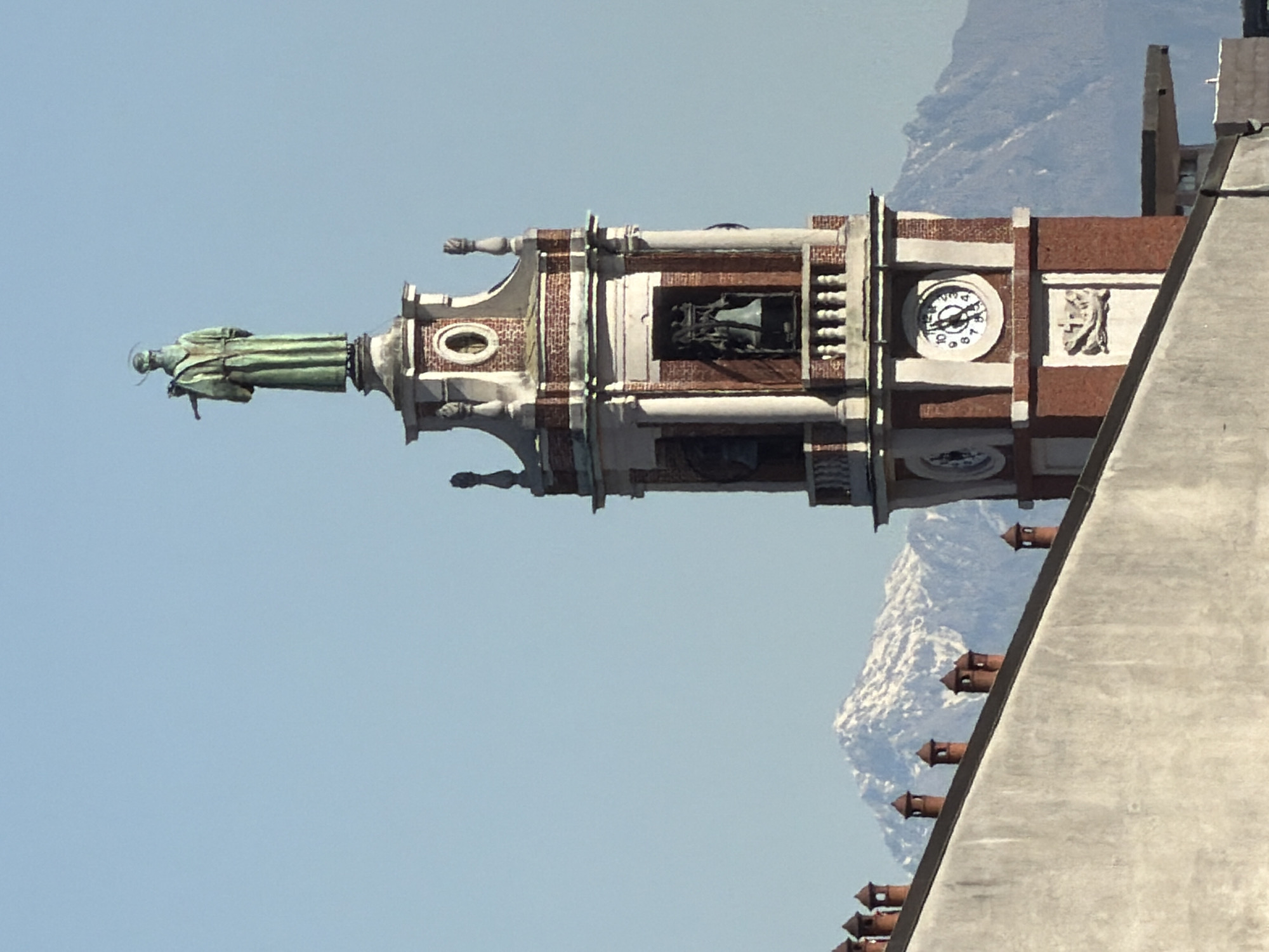 The image depicts the bell tower of the Basilica of Sant'Eustorgio in Milan, Italy. The tower features a statue atop the structure. A clock is visible on the side of the tower. Brick and white stone adorn the architecture. In the background, a snow-capped mountain range is present. A roof is visible in the foreground with multiple chimney-like structures. The sky is a clear blue.