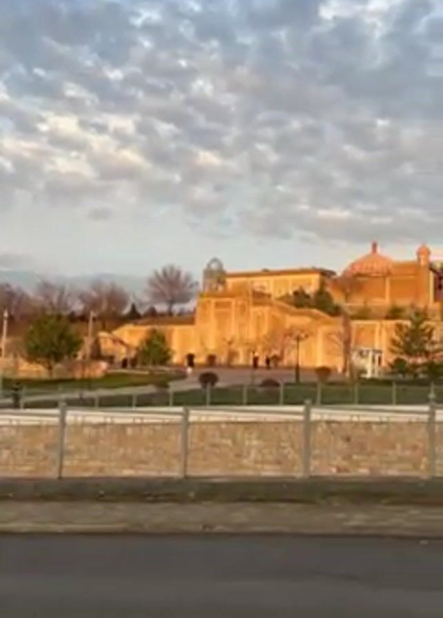 The camera captures a static, mid-range view of a tan-colored building with a distinctive domed roof, likely a mosque or cultural center, set against a backdrop of a cloudy, early-morning or late-afternoon sky