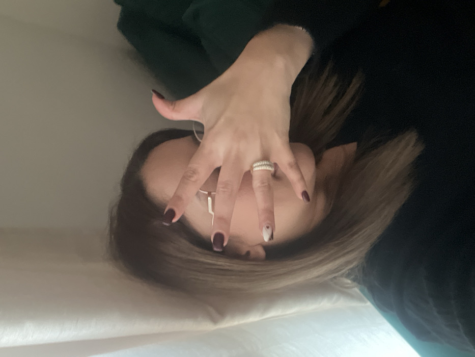 The image depicts an individual indoors, with no discernible features to identify a specific geographical location such as Caen, France. The subject, appearing to be female, is shown from the chest up, with her left hand covering the upper portion of her face. **Details of the Subject:** * **Hair:** Straight, medium-length brown hair extends down to shoulder level. * **Facial Features:** The eyes, nose, and forehead are obscured by the hand. Part of the lower face, including the chin and mouth area, is visible. * **Eyeglasses:** Gold-toned wire-frame eyeglasses are partially visible across the bridge of the nose, featuring a distinctive wavy or zig-zag pattern on the visible temple arm. * **Clothing:** The individual wears a dark, long-sleeved garment, likely black. * **Left Hand:** The left hand is positioned vertically over the face. * **Nail Polish:** Fingernails on the index, middle, ring, and pinky fingers are painted a dark red or burgundy color. The thumbnail is not visible. The nail of the left ring finger features a white base with a small black dot design. * **Rings:** Two stacked rings are worn on the left ring finger. The lower ring consists of three bands adorned with numerous small, light-colored stones. The upper ring consists of two bands, also set with similar stones. **Environment:** * **Background (Left):** A light-colored, possibly beige or off-white, curtain hangs vertically. * **Background (Right):** A dark green upholstered surface, consistent with a sofa or pillow, is visible. * **Lighting:** The scene appears to be lit from the left, casting a subtle shadow.